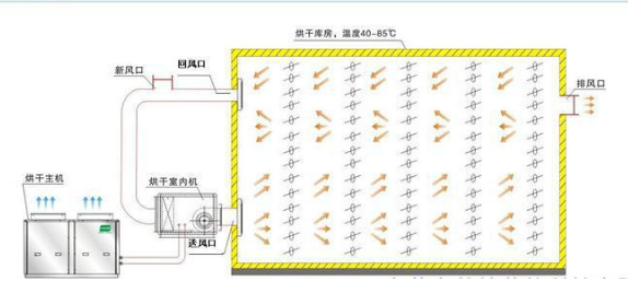 3.循環風系統:將熱量帶到烘干房的每個角落提升烘干房的溫度,并將物料蒸發出來的水分帶走。